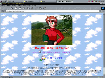 | 月刊Web MC4号 = Part1 = 「携帯GAMEマシン」 = Part2 = 「気合いで運べ!(モバイルでゲームな話)」 = Part3 = 「第1回・あれに見えるは東大寺!」 = Part4 = パソコン購入計画No.4「PC−98シリーズ」 = Part5 = うちのパソコン自慢 第四話「常駐されるという恐怖」 = Part6 = DOSマシンでWWWみちゃうんです(前編) = Part7 = 超さらしもん「新スーパーロボット大戦 スペシャルディスク」 = Part8 = 若年寄の釣行記 第4回 「出ました!今年の1発目!」 = Part9 = ちょっといい話 その3〜「骨粗鬆症について」 = Part10 = CGコーナー = Part11 = 感想及び、メンバー募集!! = Part12 = バックナンバー = Part13 = 編集後期