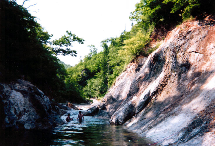 温泉のすぐ横で川遊びができる。川は結構深いところもあ